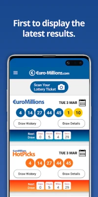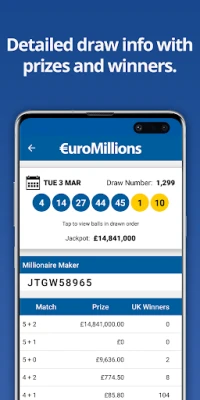 Get the latest EuroMillions results within seconds of the draw taking place. This easy to use app shows the EuroMillions numbers (including associated draws like the Millionaire Maker, Irish Raffle and EuroMillions Plus) and full prize breakdowns including number of winners and prizes paid.