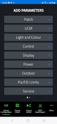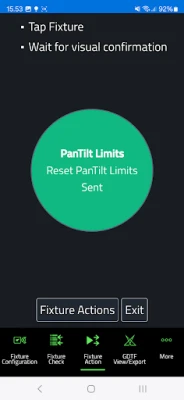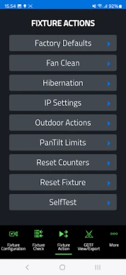 FIXTURE ACTION: Allows starting simple fixture actions such as running SelfTest sequences, resetting to factory defaults, and more. Simply tap all fixtures, while still inside their flightcase, to get them quickly reset to factory defaults.